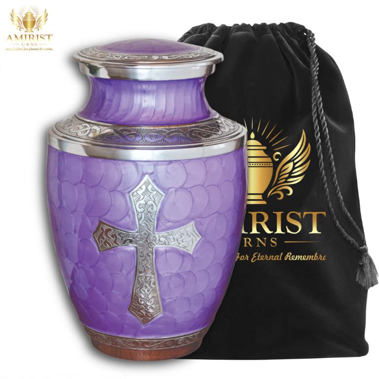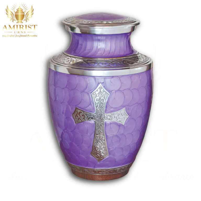 Purple Adult Cremation Urn with Silver Cross – Handcrafted Metal Memorial Urn for Human Ashes | Amirist Urns