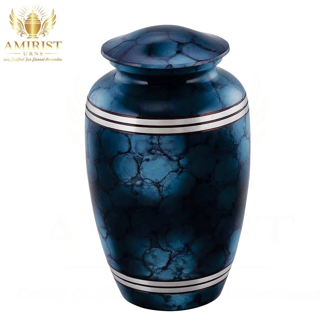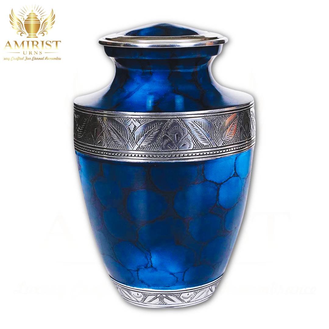 Amirist Urns® Large Blue Cremation Urn for Adult Ashes – Metal Funeral Memorial Urn with Silver Engraved Band
