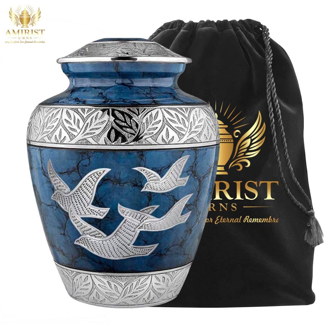 Amirist Urns® Large Blue Cremation Urn for Adult Ashes – Silver Dove Metal Funeral Memorial Urn