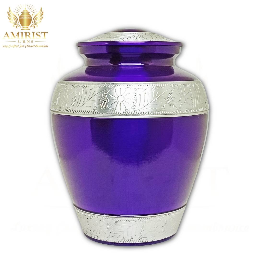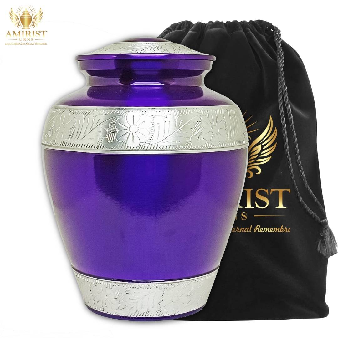 Amirist Urns® Premium Purple & Silver Cremation Urn for Human Ashes – Elegant Adult Funeral Memorial Urn with Floral Engraving & Secure Lid (200+ Cu In)