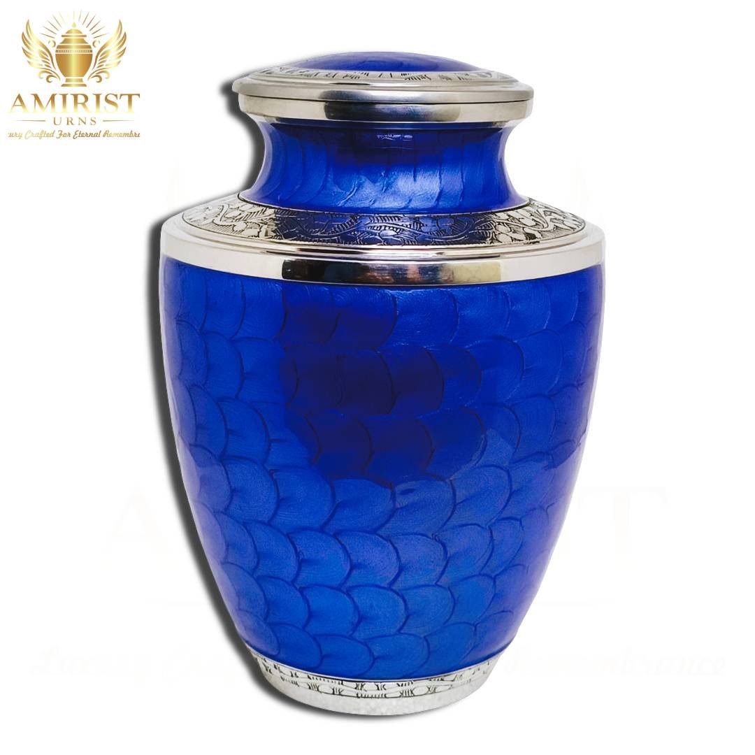 Amirist Urns® Large Blue Cremation Urn for Adult Ashes – Silver Engraved Metal Funeral Memorial Urn