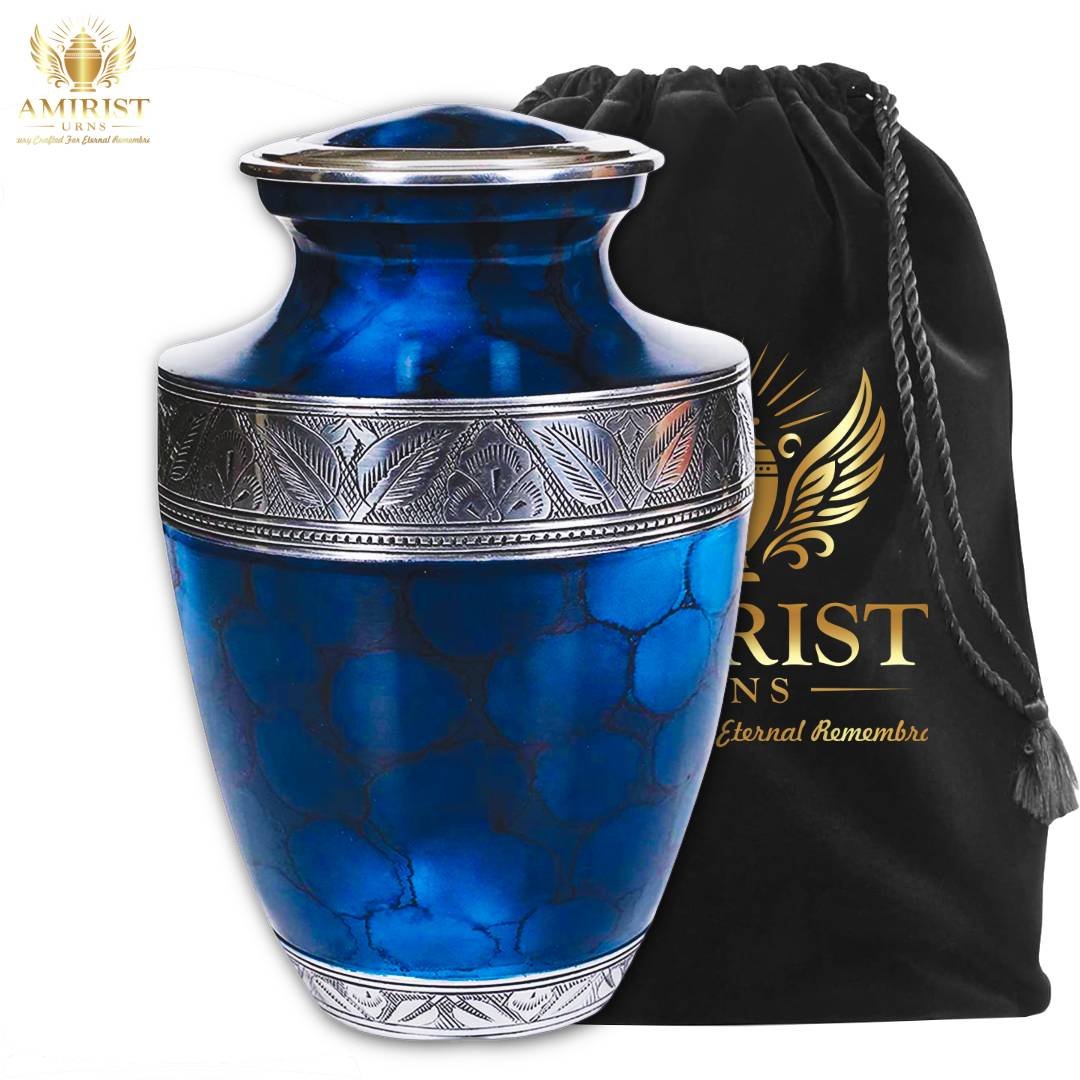 Amirist Urns® Large Blue Cremation Urn for Adult Ashes – Silver Engraved Metal Funeral Memorial Urn